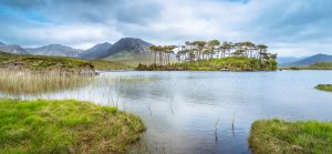 Die Insel „Twelve Pines“ im Derryclare Lough in Irland, mit den Twelve Bens of Connemara im Hintergrund.